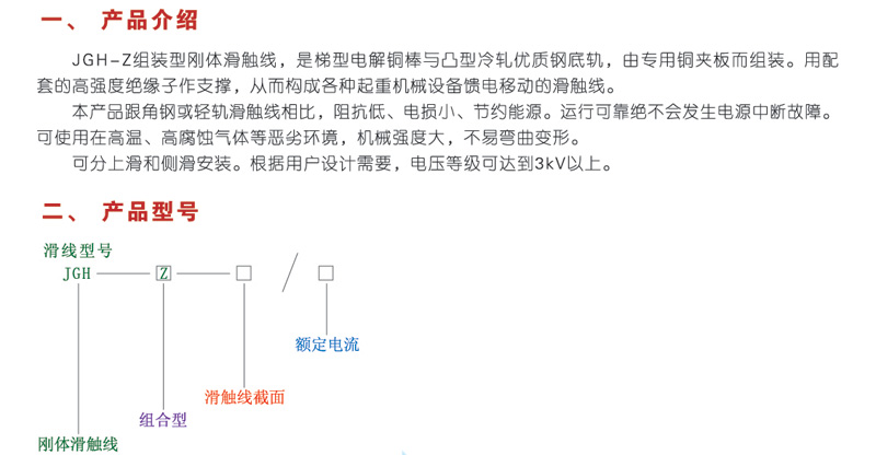JGH-Z组装型刚体滑触线,是梯形点解铜棒与凸型冷轧优质钢底轨,由专用铜夹板而组装。用配套的高强度绝缘子作支撑,从而构成各种起重机械设备馈电移动的滑触线...