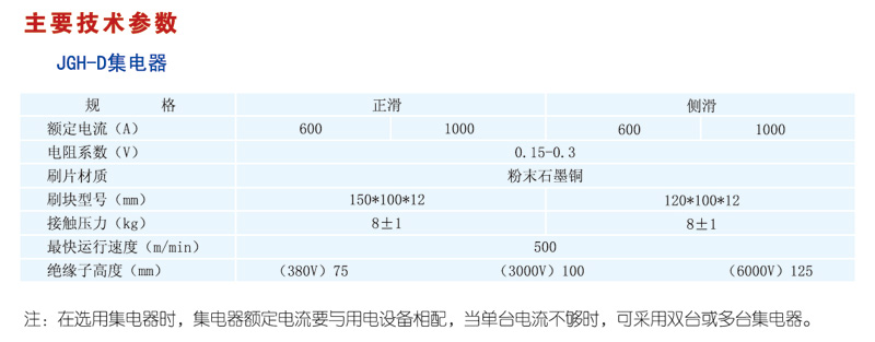 注:在选用集电器时,集电器额定电流要与用电设备相配,当单台电流不够时,可采用双台或多台集电器...