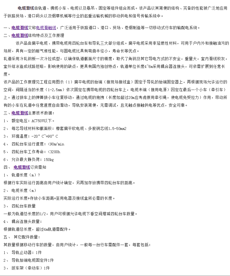 公司主要产品有:滑触线、滑线、电缆滑线,集电器,行车滑触线,安全滑触线、电缆桥架、母线槽、电缆拖链、橡套扁平电缆等多种产品。滑线系列,新颖的一体化设计,使导体与绝缘材料间...